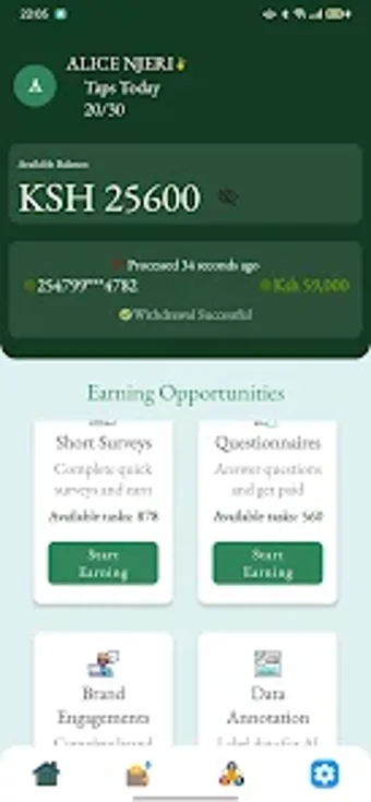 مع إكمال المستخدمين للمهام، يجمعون النقاط التي يمكن تحويلها إلى نقود حقيقية، يمكن سحبها مباشرة إلى حساب M-Pesa. يقدم التطبيق بانتظام فرص كسب جديدة، مما يسمح للمستخدمين بزيادة أرباحهم بناءً على توافرهم. مع نظرة عامة شفافة على الأرباح وحالات السحب، يمكن للمستخدمين تتبع تقدمهم بفعالية، وفريق الدعم متاح لأي مساعدة مطلوبة.